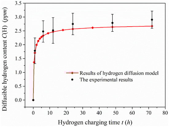 - The diffusible hydrogen content in the 1-mm-thick sample is very close to the analytical solutions under different hydrogen charging time, and it is close to the saturation value when the hydrogen charging time reaches 48 h.