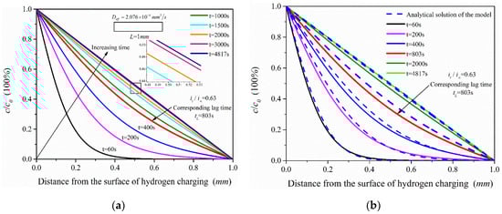 Hydrogen concentration distribution under different permeation time: (a) Finite element simulation results of the hydrogen permeation model; (b) Comparison of the analytical solution of the hydrogen permeation model and the simulation results.