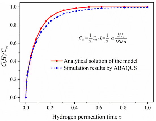 According to the simulation results (Figure 9a), the hydrogen concentration in the hydrogen permeation model increases with permeation time and tends to the steady state. In addition, it shows that when t = 1500 s (τ = 0.4152), the hydrogen permeation process is close to the steady state; especially when the permeation time is 2000 s and 3000 s, the distribution of hydrogen concentration is very close to the steady state (when t = 4817 s (τ = 1)). The hydrogen concentration in the hydrogen permeation model is linearly distributed when hydrogen permeation process reaches the steady state. Comparing the analytical solutions of the model, the hydrogen concentration distribution and the change trend of hydrogen content (Figure 10) of the two are almost consistent, with only slight deviation in the middle process of hydrogen permeation. Considering hydrogen diffusion also driven by the gradient of chemical potential in ABAQUS mass diffusion module, the simulation results are slightly different from the analytical solutions of the model obtained according to Fick law. With the increasing hydrogen content in the model, chemical potential gradient equation would have a certain inhibitory effect on hydrogen diffusion compared with the diffusion based on Fick law alone, especially in the middle state of hydrogen permeation process, which leads to the simulation results slightly lower than the analytical solutions of the hydrogen permeation model. Figure 10 shows that the simulated hydrogen content is slightly lower than the analytical solutions of the model only in the middle of hydrogen permeation, but the overall change trend of hydrogen content in the hydrogen permeation model is very close.