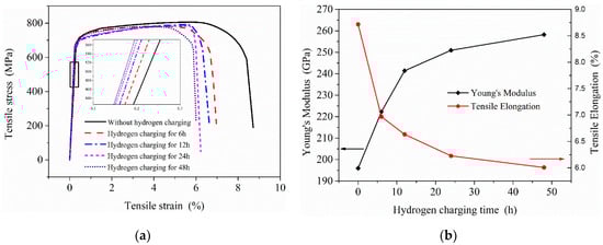 Effects of hydrogen charging on the mechanical properties of 2.25Cr1Mo0.25V steel: (a) stress–strain curves of samples under different hydrogen charging time; (b) the change of Young’s modulus and tensile elongation.