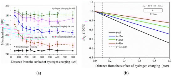 Figure 14a shows the microhardness test results of the samples after different charging time. For the sample without hydrogen charging, the microhardness of the material is close along the thickness direction. In contrast to the hydrogen-free case, the microhardness of the samples after hydrogen charging presents an increasing trend, but the increased value was not uniform, which is related to the hydrogen concentration at different locations. According to the test results, the microhardness showed a decreasing trend along the thickness direction (hydrogen diffusion direction) when the hydrogen charging time was only 6 h. With the increase of hydrogen charging time, the overall microhardness of the sample also increased. This shows that the microhardness of this material was extremely sensitive to the hydrogen introduced, and the higher hydrogen concentration in the sample, the greater its microhardness. Figure 14b shows the diffusible hydrogen concentration distribution after charging according to Equation (5). It is acceptable that the microhardness distribution measured in the experiment is very similar to the hydrogen concentration distribution under the hydrogen diffusion model. Therefore, the distribution of hydrogen concentration in the material could also be shown by microhardness test results.