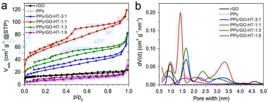 The nitrogen adsorption–desorption at 77 K and the QSDFT pore size distribution profiles of the PPy/GO-HT hybrids and their precursors are presented in Figure 1. The textural parameters calculated from the N2 adsorption data are included in Table 1. Distinct differences in the isotherms between rGO and the polymer-based materials indicate their divergent characteristics (Figure 1a). According to the IUPAC classification, rGO exhibits a type I isotherm associated with microporous materials, while PPy and the PPy/GO-HT-1:9 composite present a type III isotherm, indicating poorly developed porosity. However, hybrids with 3:1, 1:1 and 1:3 PPy to GO mass ratios exhibit a type IV isotherm with an H2 hysteresis loop [27]. Hybrid PPy/GO-HT materials present mixed microporous and mesoporous traits with clearly visible maxima on the PSD profiles at different values between 1 and 3.5 nm (Figure 1b). Graphene material shows one strong maximum at a pore width of 1 nm. The specific surface areas (SBET) of PPy and rGO are 20 and 51 m2 g−1, respectively (Table 1). The relatively low porosity of the rGO is probably related to the significant restacking of the graphene nanosheets, which occurs under hydrothermal conditions without mixing due to the van der Waals interactions [28,29]. However, the combination of 25 to 75 wt.% of PPy with GO dispersion in a hydrothermal-assisted, self-assembled synthesis resulted in binary hybrids with a more developed porous structure compared with their precursors. The highest development of binary material porosity was when an equal mass ratio of PPy to GO (1:1) was applied, achieving a SBET area of 199 m2 g−1 (Table 1). Such a phenomenon can be explained by the self-organization of PPy aggregates on the GO surface, which act as spacing agents during hydrothermal synthesis and prevent the significant restacking of the graphene nanosheets [28,30]. Additionally, the introduction of the polymer nanoparticles to the GO dispersion led to the development of mesopores, increasing their contribution from 32% for rGO to 54–67% for PPy/GO-HT hybrids (Table 1). In the case of PPy/GO-HT-1:9, the minor addition of a non-porous PPy resulted in a decrease in the composite SBET area due to the blockage of the rGO pores with conductive polymer [16].