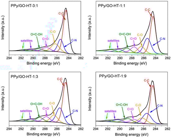 The results obtained from the XPS analysis for the hybrid materials and their precursors are presented in Table 2. The rGO is characterized by a high amount of oxygen (17.1 at.%). The C1s high-resolution deconvoluted spectrum shows a significant contribution of hydroxyl, carbonyl and carboxyl groups, as well as of carbon in sp3 hybridization (Figure S1). These results indicate only the partial reduction of GO during the hydrothermal synthesis [23,26]. The C1s core level spectra for PPy and the PPy/GO-HT hybrids were deconvoluted into seven components: C–C (284.5), C–N (285.6 eV), C–O (286.1 eV), carbonyl/quinone (287.5 eV), carboxyl groups (288.6 eV) and two satellite peaks for the carbon–carbon and carbon–nitrogen bonds at 290 and 291.6 eV, respectively (Figure 3 and Figure S1) [16,18,32]. Slight differences in the contribution of oxygen functionalities between the PPy/GO-HT hybrids are observed due to the various amounts of PPy introduced into the GO dispersion. As the synthesis procedure is based on a self-assembling process, we assume that different kinetics of the GO reduction occur, suggesting competition between PPy and GO interactions and GO reduction [33]. It should be noted that oxygen functionalities originate not only from graphene material but also from oxalate groups formed during the polymerization process with APS as an initiator [34].