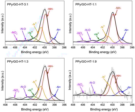 N1s high-resolution spectra of the PPy/GO-HT hybrids with different component mass ratios.