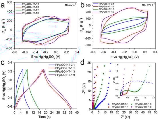 The electrochemical properties of the as-prepared materials were measured in a three-electrode system. The CV curves of the PPy/GO-HT hybrids at scan rates of 10 and 100 mV s−1 are shown in Figure 5a,b, respectively. All the composites exhibit a quasi-rectangular shape with redox humps on the CV curve, indicating their pseudocapacitive properties, which originate from the applied precursors. The CV curve shapes of PPy/GO-HT-1:1 and PPy/GO-HT-1:9 resemble that of the rGO, while those for PPy/GO-HT-3:1 and PPy/GO-HT-1:3 are similar to that for the PPy (Figure S3). However, the contribution of the EDL capacitance to the overall electrochemical performance is negligible, as the specific surface area of the hybrids does not exceed 200 m2 g−1. The pseudocapacitive humps observed in the CV profile of rGO are related to the high amount of oxygen functionalities, which contribute to the overall capacitance, especially in an acidic electrolyte [37]. Furthermore, the shape of the CV curves is changed drastically when the scan rate is increased up to 100 mV s−1 (Figure 5b). The significant deterioration of capacitive properties of the binary hybrids with 3:1 and 1:3 GO to PPy mass ratios, as well as the PPy itself (Figure S3b), was observed, indicating limited charge transfer within the electrode material [38]. At the high scan rate of 100 mV s−1, PPy/GO-HT-1:1 and PPy/GO-HT-1:9 show the best electrochemical performance. The former composite is characterized by the most developed porous structure and a high conductive polymer contribution, while the latter hybrid displays excellent charge propagation, which can be attributed to the interconnected and highly conductive graphene structure [19,39].