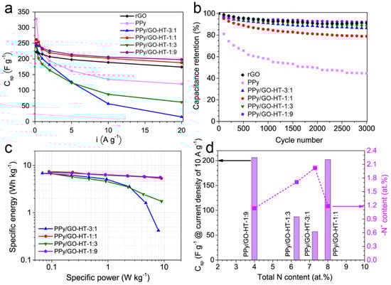 Electrochemical measurements in an aqueous acidic electrolyte showed interesting results for two hybrid materials that differ significantly in terms of morphology and porous structure; however, their electrochemical performance is similar. We revealed that chemical composition is a crucial factor that influences the capacitive characteristics of the hybrid polypyrrole-reduced graphene oxide materials, especially at high current densities. Figure 6d presents the correlation between the composite specific capacitance at a current density of 10 A g−1 and the total nitrogen content and calculated amount of protonated amine -N+ (polaron). For the binary materials with PPy to GO mass ratios of 3:1, 1:1 and 1:3, the total amount of nitrogen is similar, ranging from 6.3 to 8 at.%, while PPy/GO-HT-1:9 was characterized by an almost two-fold lower amount of nitrogen compared to the composite with a 1:1 mass ratio (Table 2). Although the PPy/GO-HT hybrids exhibit comparable doping levels of N+/N in the range of 22–33%, the differences in their electrochemical performance can be related to the content of polaron nitrogen present in the electrode material. PPy/GO-HT-1:1 and PPy/GO-HT-1:9 show 1.2 and 1.1 at.% of –N+ species, respectively, while much higher values are obtained for PPy/GO-HT-3:1 and PPy/GO-HT-1:3 (2.0 and 1.7 at.%, respectively). These findings suggest that the optimal amount of nitrogen polaron species results in a remarkable electrochemical performance for PPy/rGO hybrids [21,51]. The high doping levels of the polymer component in PPy/GO-HT-3:1 and PPy/GO-HT-1:3 suggest that during a hydrothermal self-assembly process, a migration of the anions occurs, accompanied by interactions with polypyrrole nitrogen. These mechanisms can lead to the quaternization of the nitrogen, thus resulting in decreased stability and increased resistivity [52].