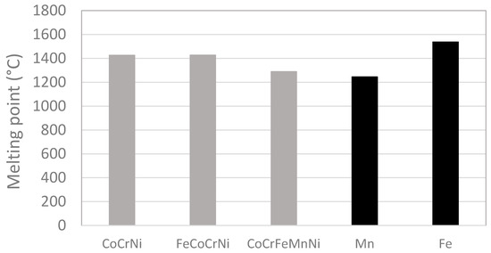 The effect of Mn and Fe on the melting point of the CoCrNi-based alloys. The melting point of Mn and Fe (black columns) was plotted for a comparison with the produced alloys (grey columns).