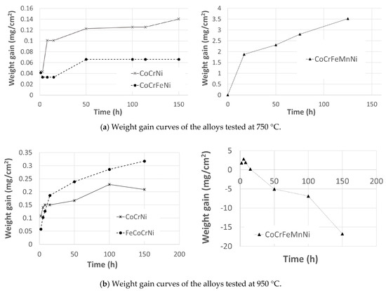 Figure 3a shows a comparison of the oxidation performance of the tested alloys at 750 °C. For CoCrFeMnNi, two-stage oxidation behavior is observed. The alloy does not form an effective oxidation barrier, as the oxidation rate in the second stage does not decrease with the oxide thickness. However, after 150 h at 750 °C, no major oxide spallation was observed. Removing manganese from the alloy composition significantly decreased the weight gain of FeCoCrNi, and the oxide provides a protective barrier against further oxidation. The results agree with [12], where the mass gain reached comparable values even though the alloy composition included a small amount of Mn. Further restriction of the composition to CoCrNi leads to a mild increase in the weight gain; however, the kinetics remained similar to FeCoCrNi.