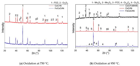The XRD analysis was performed only on CoCrNi and FeCoCrNi, as the scale on CoCrFeMnNi was spalled off. The XRD spectra proved the formation of Cr2O3 scale on both alloys (Figure 4b, Table 2). Additionally, after oxidation at 950 °C, carbide peaks disappeared from the matrix reflections of CoCrNi as well as of FeCoCrNi.