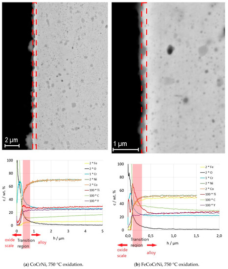 To explain the processes related to the formation of oxide scale, an in depth elemental analysis of the alloy was performed by Glow discharge optical emission spectroscopy (GDOES). The analysis was performed only for FeCoCrNi and CoCrNi; CoCrFeMnNi was not analyzed due to the formation of a nonconductive scale in the case of 750 °C oxidation and to massive spallation in the case of 950 °C oxidation. Instead, an EDS analysis was performed for CoCrFeMnNi tested at 750 °C. However, the EDS resolution is not sufficient to quantitatively analyze low-Z elements, such as C, and low concentration elements, such as Ti and Y.