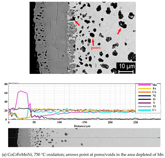 A significant difference was observed in the microstructural evolution of the alloy adjacent to the oxide scale. The scale on the CoCrFeMnNi alloy consist mainly of Mn-based oxides (Table 2), and is relatively thick compared to the Cr2O3 scale on the CoCrNi and FeCoCrNi alloy. The fast and continuous diffusion of Mn out of the CoCrFeMnNi alloy led to the formation of subsurface porosity (Figure 5c), whereas no porosity was evolved for CoCrNi and FeCoCrNi. The area depleted of Mn correlates well with the porous area. More pores were developed in the area with a lower concentration of Mn.