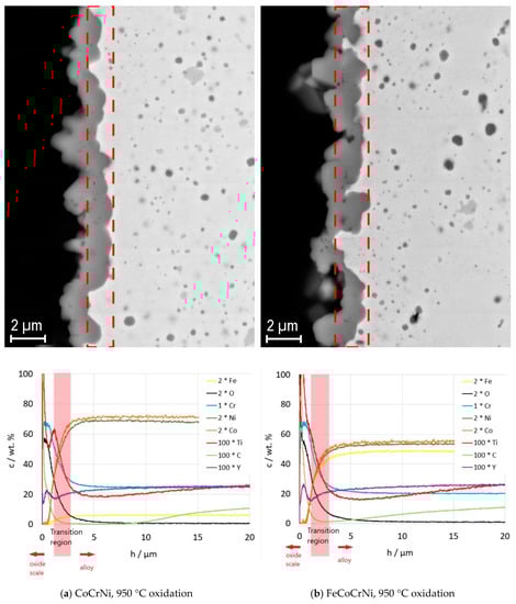 With increasing thickness, the oxide scale protrudes into the alloy and the alloy/scale interface becomes very rough (Figure 5 and Figure 6). Therefore, to interpret the GDOES results correctly, a transition region was marked in the plots corresponding to the regions marked in the respective micrographs above (Figure 5 and Figure 6). Due to the jagged interface, the results of the elemental analysis from the transition region include superposed information from the oxide and the alloy. Figure 5 shows the microstructure of the oxide scales and a plot of the elemental distribution in the oxide scales and the alloys underneath the scales after 150 h of oxidation at 750 °C. According to the results, the oxide scale consists mainly of chromium, oxygen, and carbon. There is no chromium-depleted layer formed underneath the scale, suggesting that the alloy provides a sufficient chromium supply for the scale formation up to the tested oxidation time. Both Y and Ti participate in the oxide scale formation. There is a sharp decrease in Y and Ti towards the surface in the oxide scale grown on CoCrNi at 750 °C (Figure 5a), whereas a Ti peak and an increased amount of Y is found in the scale grown on FeCoCrNi near the oxide surface (Figure 5b). The increase in Ti in the scale on FeCoCrNi correlates with the decrease in Cr. Ti was reported to have a good solubility in Cr2O3 [34]. The diffusion of Ti though the Cr2O3 scale was confirmed also on the scales grown on Ni-Cr alloys, resulting in the formation of a thin TiO2 outer layer [35,36,37]. Comparing the results for CoCrNi with FeCoCrNi (Figure 5), it is apparent that the addition of Fe into CoCrNi promotes Y and Ti diffusion through the Cr2O3 scale. Unlike Y, Ti was, however, confirmed to have properties detrimental to the oxidation resistance [36,37,38]. This fact must be considered and negotiated if needed with the design of the alloy’s temperature stability and irradiation damage resistance.