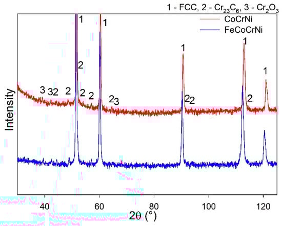 The elemental composition of the sintered alloys is summarized in Table 1. The XRD results show that all the prepared alloys have an FCC nickel-based matrix and contain additional Cr23C6 and Cr2O3 phases (Figure 1, Table 2). A possible source of carbon is the graphite die used for sintering. The oxides likely stem from inherent oxygen impurities in the Cr powder and the introduction of O2 gas during milling; minor oxygen impurities might be gained also during the sintering process, where the vacuum atmosphere is limited to 5 Pa. The spinel oxide structure is likely a Mn-based oxide, since the phase is observed only in the CoCrFeMnNi alloy. The lattice parameter is close to Mn1.7Cr1.3O4 (a = 8.424 Å). A small volume of fine nano-crystalline Y-Ti oxides distributed within a large volume of the HEA matrix is below the XRD detection limit; thus, weak diffraction peaks of the oxides are not visible in the measured spectra. The presence of the Y-Ti oxides was, nevertheless, proved in the authors’ previous study by TEM and EDS [16]. The literature reports that Y2TiO5 and Y2Ti2O7 are the most common oxides present in Y-Ti-doped alloys [23]. The phase content of the prepared alloys correlates with the data in the literature. A single-phase FCC matrix is reported for CoCrFeMnNi [10,14] as well as for CoCrNi prepared by melting and subsequent thermo-mechanical post-processing [24,25]. The presence of carbide phases depends on the amount of C intake. The carbon solubility in CoCrNi alloys is as low as 0.67 at. % [26] and, above this limit, M23C6 carbide-type is formed.