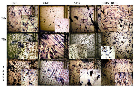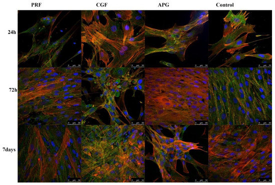 The proliferation data showed that the cells treated with L-PRF and CGF increased their proliferation at all the considered times with respect to control with 100% viability (Figure 1). In particular, the CGF condition showed a better performance at 24 and 72 h with values of 146% and 166%, respectively, followed by the L-PRF, which showed proliferation values of 125% and 145% at 24 and 72 h, respectively. The APG gave a low level of proliferation with a value of 128% during the first 72 h. The highest HPLF cell proliferation was observed with CGF at 7 days.