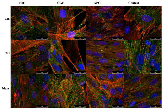 Confocal laser scanning microscopy (CLSM) images of actin filaments revealed by phalloidin in control and treated HPLF at different times, including the HPLF under the three considered conditions and the controls at the different times. Low magnification. CD90, used as an HPLF marker, is green stained. The actin is intensively represented, compared to the control. It is interesting to note how the fibroblasts in contact with the PRF show an intense stain of the actin inside the cellular projections, already at 72 h and more so at 7 days; the actin of the cells exposed to CGF is instead heavily modified and solicited; the APG has a strong representation of the actin fibers at 72 h.
