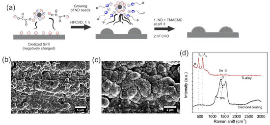 The titanium alloy (Ti6Al4V) substrates were cut into pieces of dimensions of 1 cm × 1 cm and underwent pretreatment, as follows. The substrates were grinded with SiC (silicon carbide) sandpaper (800, 1500, and 2000 ISO/FEPA Grit designation). Afterwards, they were cleaned ultrasonically in water and ethanol for 10 min, successively. After pre-treatment, the substrates were immersed in a diamond seeding solution. The seeding solutions comprise commercially available detonation nanodiamond (DND) particles (PL-Nanopure, grade G01, Plasmachem GmbH, Berlin Germany), aqueous solution, and oxalic acid at a final concentration of 7 × 10−5 mol/L. The DND particle concentration was 0.005 wt.%, while the pH was adjusted to pH 5. Subsequently, diamond was grown by hot filament chemical vapor deposition (HFCVD). The flow rates of the reaction gases CH4 and H2 were maintained at 32 sccm and 800 sccm, respectively, the temperature of the hot filaments was maintained at 2500 °C, and the gas pressure was kept at 1.5 kPa. Deposition for 1 h yielded well-distributed diamond hemispheres on the substrate. Subsequently, the substrates were oxidized and seeded again ultrasonically (15 min) with a solution comprising commercially available 0.005 wt.% DND (Chengdu Dreiway Technology, Chengdu, China) aqueous solution and 5 × 10−6 mol/L [2-(Methacryloyloxy)ethyl]trimethylammonium chloride (TMAEMC, 75 wt.% in H2O), while the pH was adjusted to 3. After a second growth step via HFCVD (same parameters) for 20 min, the diamond coatings were obtained.