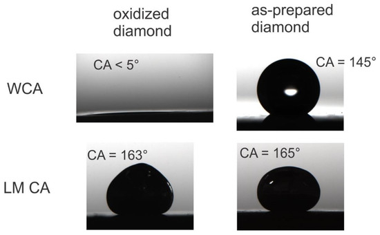 Due to the reductive reaction regime in the CVD chamber, as-made diamond coatings are hydrophobic (H-terminated) [47,48]. The structured diamond coating we produced features (super)hydrophobicity with water contact angles (WCAs) around 150° due to a Cassie state and the presence of air pockets. One feature of diamond coatings is the ability to change the surface water wettability (surface free energy) without degradation of the integrity, morphology, or topography of the coating. By exposition to air plasma, the water contact angle was lowered to ≤ 5°, as shown in Figure 2. This change in WCA is attributed to the oxidation of the surface, yielding terminal groups such as –OH, =O, –O– and so on [47]. The change in surface termination also impacted the surface free energy (SFE) of the diamond coating, and the SFE determined via the van Oss method increased upon oxidation from around 50 mN/m to around 60 mN/m, while the contribution to this SFE changed substantially. The apolar Lifshitz-van der Waals γsLW interactions were nearly the exclusive contributor for the SFE of hydrophobic diamond coatings, while polar Lewis acid-based γsAB interactions can be detected for the oxidized diamond surface [47]. To evaluate the impact of surface free energy on the adhesion and wetting of liquid metal, liquid metal contact angles and roll-off angles were measured at first. The contact angles were determined to be 163.4 ± 2.0° and 162.5 ± 2.0° on the oxidized and H-terminated diamond coating, respectively. Thus, the liquid metal contact angle appeared to be independent on the surface free energy (surface termination), while it was impacted to some extend by surface roughness [29]. This might be the reason for the fact that, in the literature, the wetting and adhesion behavior of liquid metal was mostly attributed to surface roughness. The low impact of surface free energy on the LM contact angle might be attributed to the high yield stress [26], rendering deformation of the LM droplet upon changes in surface free energy challenging. Notably, deposited LM droplets could be removed swiftly by a tweezer or tilting the sample. Despite similar LM contact angles measured on both samples, the roll off angles differed significantly. For rolling off a LM droplet from the oxidized sample, a tilt angle of 11.3 ± 1.5° was necessary, while for the hydrophobic coating, a tilt angle of only 8.5 ± 1.0° was needed. This difference that can be ascribed to hydrophilic interactions between the hydrophilic oxide skin of the LM and the hydrophilic substrate was only possible for the oxidized diamond coating. Such hydrophilic interactions were already suggested to impact adhesion of LM [22,23], for example Gua et al. employed a coating based on a glue made of hydrophilic polymethacrylates (PMA) [24], which increased the adhesion of the LM toward various substrates. The obtained increased adhesion and wettability of the LM toward the surface was presumably due to hydrogen–bond interaction and lower roughness [24].