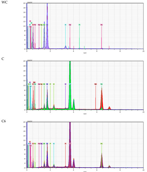 SEM analysis was conducted for white ceramics, cement with no white ceramic, blended cement with addition of 6% of ceramics and blended cement with addition of 12% of ceramics. Taken SEM photographs are presented in Figure 6 using artificial colors. The same four samples were used for energy-dispersive X-ray spectroscopy (EDS) analysis. The SEM photos and EDS analyses show that samples with 6% and 12% content of white ceramic differ both from each other as well as in relation to the reference cement sample. These differences are visible both in the composition and microstructure. Based on the results of EDS analyses (see Figure 7), it can be stated that the main elements of tested cements are: calcium, silicon and iron. In addition, the tested cements also contained small amounts of aluminum, sulfur, potassium, carbon, magnesium and phosphorus. Small amounts of titanium were detected in WC and C12 samples. The appearance of titanium in the composition of blended cement confirms the presence of ceramics in the prepared blended cement. Along with the increasing content of ceramics in the cement mix composition, the content of silicon is growing, which is the dominant component of ceramics.