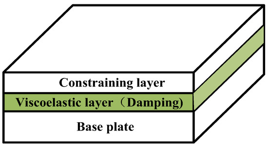 Many materials have viscoelastic properties [1,2,3], among which viscoelastic materials have excellent energy dissipation properties [4]. In engineering, they are usually laminated with elastic materials to construct viscoelastic sandwich structures, which are widely used for vibration suppression of the thin-walled structures in aerospace, automotive and ship equipment [5,6,7,8]. Figure 1 shows a viscoelastic sandwich plate structure. A viscoelastic material layer with a high loss factor is sandwiched by the base plate and the constraining layer. When the base plate is subjected to vibration, the viscoelastic layer will undergo shear deformation, which converts vibration energy into heat and dissipates it. This structure can effectively suppress the vibration without significantly changing the weight of the components. Therefore, it is widely used in the situation of strict weight restrictions [9]. For decades, the studies on the dynamic modeling, vibration and damping characteristics of the viscoelastic sandwich plates have been hot topics.