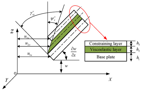 The geometric deformation relationship of each layer of a sandwich plate in the plane is shown in Figure 2. and are the mid-plane displacements of the base plate, the viscoelastic layer and the constraining layer along the X direction, respectively. and are the thickness of the base plate, the viscoelastic layer and the constraining layer, respectively. and denote the deflection and the angle around the y-axis of the sandwich plate, respectively. and denote the angle around the Y-axis and shear strain in the plane of the viscoelastic layer, respectively.