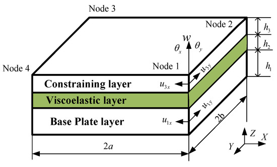 It is assumed that the plate satisfies the Kirchhoff–Love hypothesis. The shear strains of the two elastic surface layers (the constraining layer and the base plate) are ignored, and only the shear strain of the viscoelastic layer is considered. The deflections of the layers in the thickness direction can be ignored, that is, the three layers have the same deflection. The elastic layers do not dissipate vibration energy, the viscoelastic layer is incompressible material, and the vibration energy is dissipated only through its shear deformation. The viscoelastic layer is a linear viscoelastic material. Each layer is perfectly bonded and there is no relative sliding.