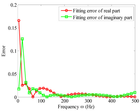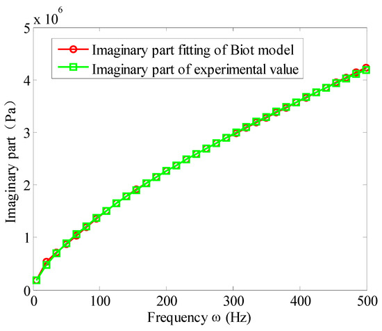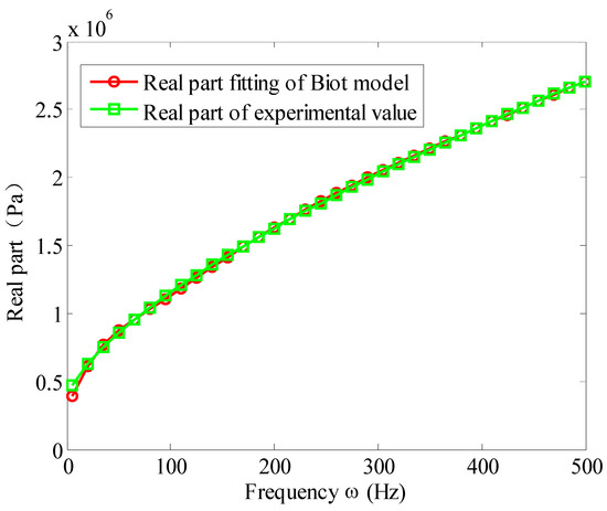 According to Equation (43), one can get the measured complex modulus value of the viscoelastic materials, and then substituting them into Equation (31), by nonlinear curve fitting, and the parameters of the Biot model can be obtained as shown in Table 4. Figure 5, Figure 6 and Figure 7 show the comparison of the fitted Biot model and the experimental value in reference [32]. The fitting of the real and imaginary parts are shown in Figure 5 and Figure 6, respectively. The fitting error is shown in Figure 7.