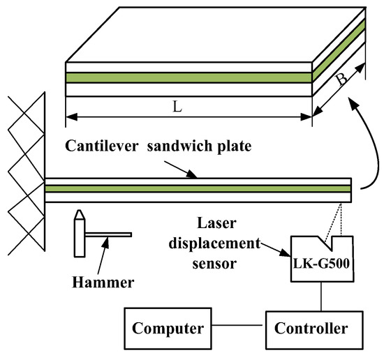 The sandwich plate is excited by an impact hammer with a hard hammerhead. The top displacement signal of the plate is measured by a laser displacement sensor (LK-G500, Keyence Corporation, Osaka, Japan) at the middle-end of the test plate which has an accuracy of 0.005 µm over a frequency band between 0 and 392 KHz. The laser displacement sensor is equipped with data acquisition software named LK-Navigator which is installed on the computer. Through the acquisition software, one can issue commands to the controller to control the sampling points and the sampling frequency. In the experiment, the sampling points are set to 50,000 and the sampling frequency is set to 5000Hz.