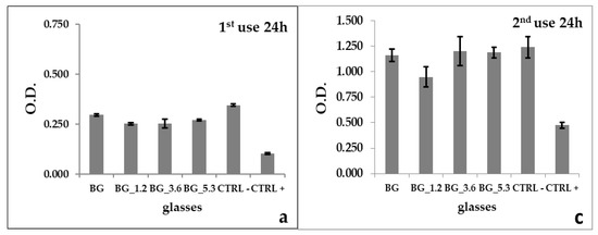 For all assays performed, comparisons among groups considering the first and second use samples for each glass (BG_1.2, BG_3.6 and BG_5.3), both after 24 and 72 h, were tested using Student’s t-test, as shown in Table 2. Differences between the first and second use samples were considered statistically significant for p-values <0.05 and nonsignificant for p-values ≥0.05. All analyses were performed using the Excel® software for Windows (Microsoft Office Professional 2016, version 16.0.4266.1001, Microsoft Corporation, Redmond, WA, USA).