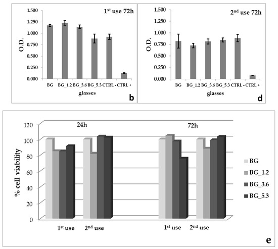 The results of MTT tests are reported in Figure 2a–e. All cerium-doped glasses, at the first use, favor the viability of MLO-Y4 cells both after 24 h (112.98%, 125.43%, 137.36%) and 72 h (111.02%, 107.41%, 105,23%) respectively for BG_1.2, BG_3.6 and BG_5.3, as observed previously [48]. After 24 h, the results of the second use are consistent with those of the first use; on the contrary, at 72h we detected an unequivocal decrease in cell viability (55.67%, 59.06%, 61.74% respectively for BG_1.2, BG_3.6 and BG_5.3).