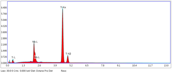 The Ti-27Nb alloy contain two main constituent elements titanium (Ti) and niobium (Nb) 26.01 ± 1.05 wt.%. Figure 1 shows the EDS analysis pattern of the as received sample at the fracture surface area, which confirmed the presence of Ti and Nb in desired ratio.