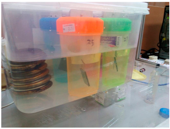 Jars containing specimens in Simulated Body Fluid (SBF) with heating filament for maintaining temperature.