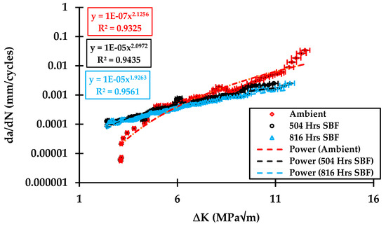 da/dN vs. ∆K results for the ambient, 504-, and 816-hr samples in simulated body fluid (SBF). Power in Figure shows that the curve fit has been achieved using the power law.