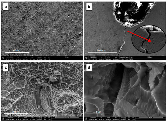 This usually occurs due to the colonies of lath α and β in the bimodal microstructure, which acted as an effective slip barrier to prevent the transferring of slip to neighboring colonies. When the crack propagated through the boundary of these colonies, it also changed the direction. Thus, they caused crack branching and secondary crack creation and hence reduced the crack growth rate due to redistribution of stresses [27]. The crack deflection and crack branching, consequently, occurred which ultimately increased the crack propagation resistance of the material as well as toughness. Figure 7c shows the fracture surface of the sample, which exhibited mixed morphology of transgranular ductile and brittle behaviors in the form of dimples and cleavage facets, respectively. In the bimodal microstructure, cleavage facets usually formed at primary α-grains, whose large boundaries comprise weak sites. Striations, which are the main feature of the fatigue fracture, have also been observed in Figure 7d. These striations demonstrate the position of the crack tip at the given cyclic load and create ridges that spread from the initiation site. These ridges are perpendicular to the direction of fatigue crack propagation, as is clearly shown in the micrograph.