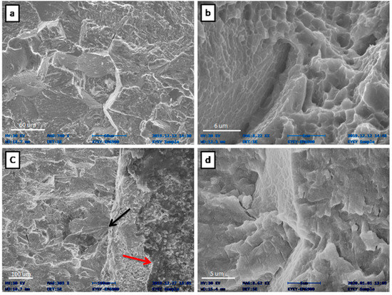 Figure 8 shows the fracture surfaces of the specimens, kept in the simulated body fluid for 504 and 816 hrs. The appearance of the fracture surfaces in Figure 8a,b mainly show the transgranular faceted fracture as well as intergranular fracture mode, which was kept in the simulated body fluids for 504 hrs. The intergranular mode is mainly related to the brittle failure in which the preferential crack propagation is at the grain boundaries. Loss of ductility or embrittlement is often accompanied by a change in the fracture mode from transgranular to intergranular fracture [28]. This intergranular fracture is ascribed to the corrosion fatigue, which occurs due to chemical dissolution along the grain boundaries when placed in body fluids. Brittle behavior has been observed in many Ti alloys when it is used in different chemical solutions [23,29,30]. This results in a relatively straight profile of the crack and fast crack growth. Figure 8c,d shows the fracture surface of specimen that is placed in body fluid for 816 hrs. The black arrow in Figure 8c shows the crack initiation site and red arrow shows the thick layer of film that is created on material surface due to the corrosive influence of SBF. Similar corrosion behavior of titanium alloys due to the influence of SBF has also been reported by Niionmi et.al [23,25,30]. The crack surface shows the cleavage and rougher fracture surface, which is attributed to the highly brittle failure and fast crack propagation due to corrosion fatigue. Cleavage cracks are known to grow faster than crack which shows striations [31]. By evaluating the fatigue crack growth (da/dN) and fracture surfaces of the specimen, it can be observed that the fatigue crack propagation of material increased when placed longer in fluids. This is because of the corrosion fatigue due to the chemical environment of the body fluid. In such an environment, the higher the immersing time of the specimen in the simulated body fluid, the higher the fatigue crack propagation due to corrosion fatigue, which is also reported in other studies [23,26,27,30,32]. Moreover, fatigue striations are not observed in both samples in contrast to specimens tested in ambient environment which also proved the fast crack propagation behavior.
