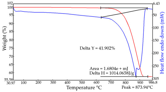Figure 2) has one endothermic effect, corresponding to the decomposition of calcium carbonate. The endothermic effect has two peaks, which may indicate that the studied calcium carbonate is mainly represented by calcite and possibly contains minor impurities of dolomite [