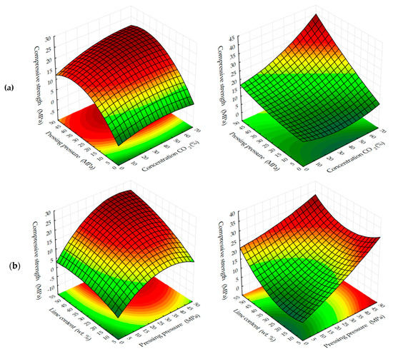 The analysis of changes in compression strength depending on the content of lime binder, forming the pressure of pressing and concentration of CO
