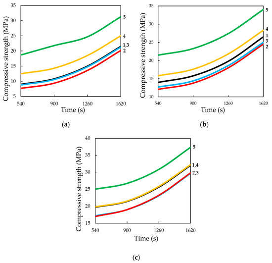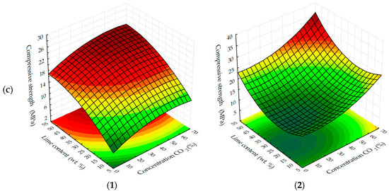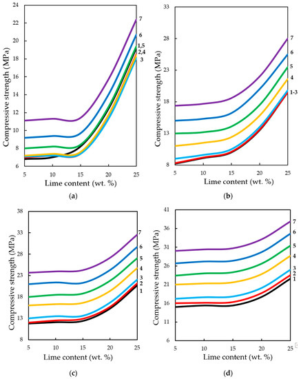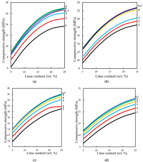 2 up to 15% wt. in their composition, there is some decrease of compressive strength, with increasing content of lime in the composition—the strength increases. It seems that this could be an error in program calculation. The strength at the content of calcium hydroxide in the moulding mixtures within 5% wt.–15% wt. changes insignificantly, and with an increase in the content of Ca(OH)