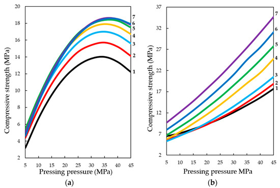 29] According to the experimental data, the compressive strength increases with the increase in molding pressure up to 33–38 MPa, after which, with the increase in molding force up to 45 MPa, R