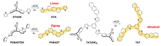 In the above context, we are working on the solution deposition of acene-based small-molecule semiconductors via a “photoprecursor approach” as a means to prepare active layers of organic electronic devices [,,,]. This approach relies on the photo-induced decarbonylative aromatization of α-diketone (DK)-type precursors (Figure 1), the mechanism of which has been discussed previously []. Specifically, well-soluble DK-type derivatives are solution-deposited, and then irradiated typically with visible light of around 470 nm to generate corresponding acene compounds. The DK-to-acene conversion is usually accompanied by a decrease in solubility, and when the solubility of the resulting acene is sufficiently low, another material can be deposited on top of it as a solution. Accordingly, the photoprecursor approach enables controlled layer-by-layer solution deposition of organic semiconductors.