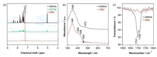 Spectroscopic changes associated with the photoreaction of TAT(DK)2: (a) 1H NMR spectra of a CDCl3 solution (400 MHz); (b) UV–vis absorption spectra of a thin film; (c) IR spectra of a thin film.