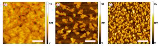Tapping-mode atomic-force-microscopy images of thin films prepared through the photoprecursor approach: (a) TAT (RRMS = 0.9 nm); (b) DTA (7.0 nm); (c) PhBADT (11.9 nm). The scale bars correspond to 0.5 μm.
