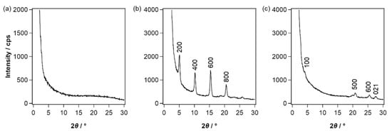 Out-of-plane X-ray-diffraction profiles of thin films prepared through the photoprecursor approach: (a) TAT; (b) DTA; (c) PhBADT.