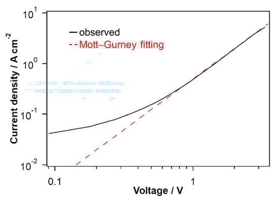 Current–voltage characteristics of a hole-only device with a structure of (ITO/MoO3/TAT/MoO3/Al). The μh was estimated as 1.4 × 10−4 cm2 V−1 s−1 based on the Mott–Gurney law. Voltage for the observed data is defined as Vappl–Vbi–Vs, wherein Vappl is the applied voltage, Vbi is the estimated built-in voltage, and Vs is the estimated voltage drop associated with series resistance.