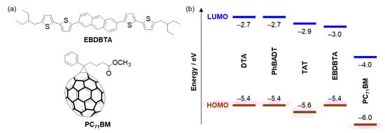 (a) Chemical structures of EBDBTA and PC71BM. (b) Frontier-orbital energy levels of the active-layer materials in the thin-film state. For DTA, PhBADT, TAT, and EBDBTA, the HOMO levels are the IE measured by photoelectron spectroscopy in air, while the LUMO levels are the addition of HOMO and optical band-gap energies. The values for DTA, PhBADT, EBDBTA, and PC71BM are adopted from the literature [,,]. The photoelectron spectrum of TAT is shown in Figure S19.