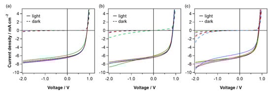 J–V curves of the p–i–n-type OPVs comprising different p-sublayer materials: (a) TAT; (b) DTA; (c) PhBADT. Data of six devices are overlaid in each graph. The data are those used to calculate the average photovoltaic parameters in Table 1.