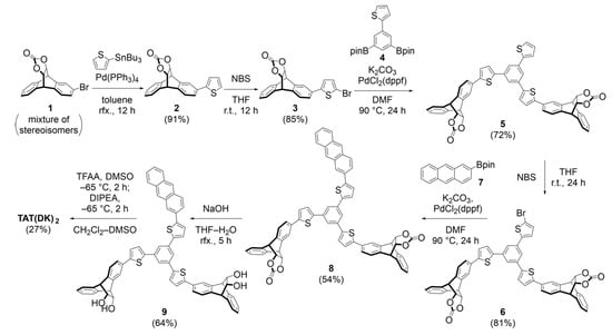 As summarized in Scheme 1, the synthesis of the photoprecursor TAT(DK)2 was started from bromoanthracene–vinylene carbonate adduct 1 []. This Diels–Alder adduct was subjected to the Stille coupling with 2-(tributylstannyl)thiophene to form compound 2 followed by bromination at the α-position of the thienyl group. The resulting bromide 3 was then reacted with diboronate 4 under Suzuki cross-coupling conditions to form 5 having the 1,3,5-trisubstituted benzene core. Another bromination was performed to afford compound 6, which was then subjected to the Suzuki coupling with 2-borylanthracene 7 to construct the windmill-like backbone of compound 8. After saponification of the carbonate units, bis(diol) 9 was oxidised under Swern conditions to give the target compound TAT(DK)2 in 27% yield. Note here that the reaction yield of TAT(DK)2 is almost quantitative as judged from nuclear magnetic resonance (NMR) analysis of a crude product; however, the removal of minor by-products required repetitive column chromatography and reprecipitation treatments, limiting the isolation yield of a high-purity portion. This inefficiency in purification is a target of improvement in future work. Details of the synthetic procedures and spectroscopic data are provided in Section 4.2 and Figures S2–S16.