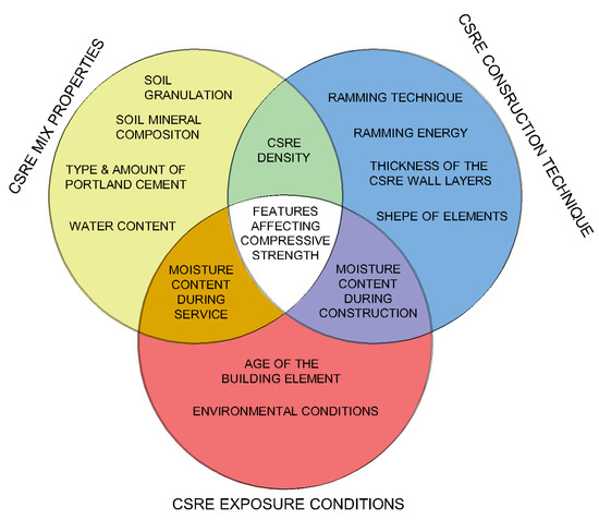 According to Eurocode 0 [4], every structure should be designed in such a way as to have adequate load-bearing capacity, usability and durability. Therefore, the critical properties of a construction building material are its durability and the compressive strength. In the case of cement stabilized rammed earth (CSRE), both properties will depend on the features of the soil–cement mixture, construction technique, and exposure conditions (Figure 1) [5,6].