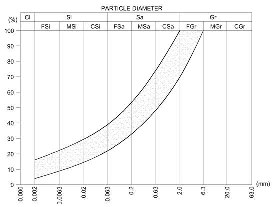 Inorganic soils for laboratory tests were prepared by mixing in a different proportion of natural 40–80% sand (0–2 mm), 0–40% gravel (2–4 mm), and 20–40% of silty clay. The sand was composed of pure quartz. Gravel fractions were composed of quartz (75% by mass) and carbonate crumbs (25% by mass). Silty clay mineral composition is shown in Table 1. The silty clay did not contain organic substances. Figure 2 shows the grain size range of the soil mixes teste. After all soil ingredients were mixed in a dry state to a homogeneous consistency different amounts (3–10%) of cement CEM I 42.5 R according to the standard EN 197-1 [29] were added and the mix was mixed again. Finally, water was added in various amounts (6–14%) and mixed again.