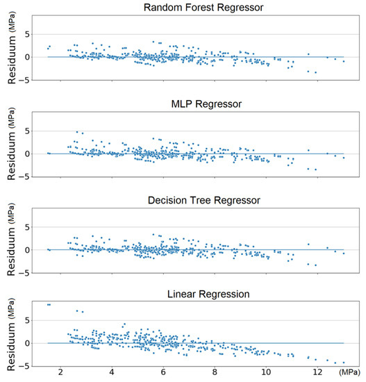 Besides the fact that the linear regression model gives much worse predictions of the compressive strength, the minimal differences between MAE values between different datasets can be observed, as well. Therefore, the following results are presented for the dataset with a column representing the sum of silt and clay, as the aforementioned differences are negligible. Residuals (presented in Figure 3) of linear regression are much higher than of the other models and they are significantly unevenly distributed. It can be concluded that the linear regression model is insufficient in predicting the compressing strength, and we discard it in the following computations.
