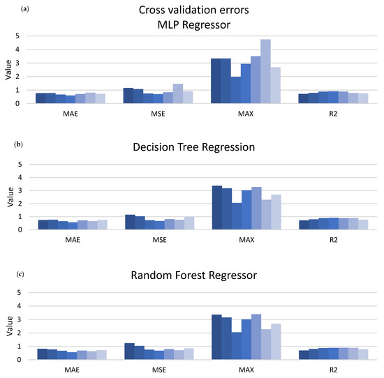 The measures of MAE, MSE, MAX, and R2 are presented in Figure 4 for all seven subsets of the cross-validated datasets. Every single column corresponds to one performance measure attained on one subset. It can be observed in Figure 4 that MLP, RFR, and DTR models behave pairwise almost identically. The following measures, MAE, MSE, R2, have different units (defined in Section 2.2.2), which is the reason for omitting to present the unit of the vertical axis in Figure 4.